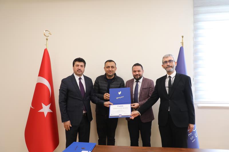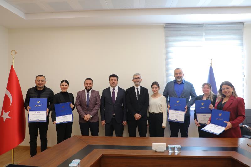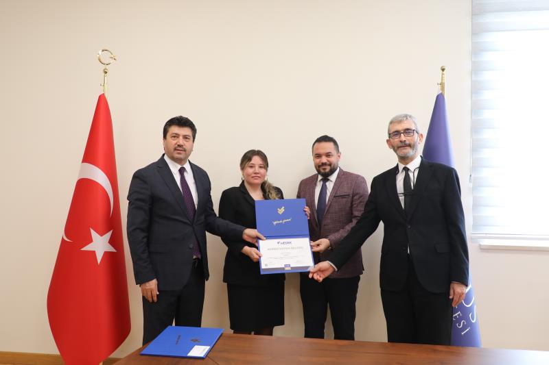 Törende Üniversitemiz Rektörü Prof. Dr. Ali Özen, Meslek Yüksekokulu Müdürü Doç. Dr. Sefa Özbek ve akreditasyon başarısı gösteren program başkanları yer aldı.